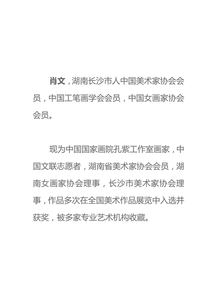 肖文,湖南长沙市人 中国美术家协会会员,中国工笔画学会会员,中国女画家协会会员。现为中国国家画院孔紫工作室画家,中国文联志愿者,湖南省美术家协会会员,湖南女画家协会理事,长沙市美术家协会理事,作品多次在全国美术作品展览中入选并获奖,被多家专业艺术机构收藏。